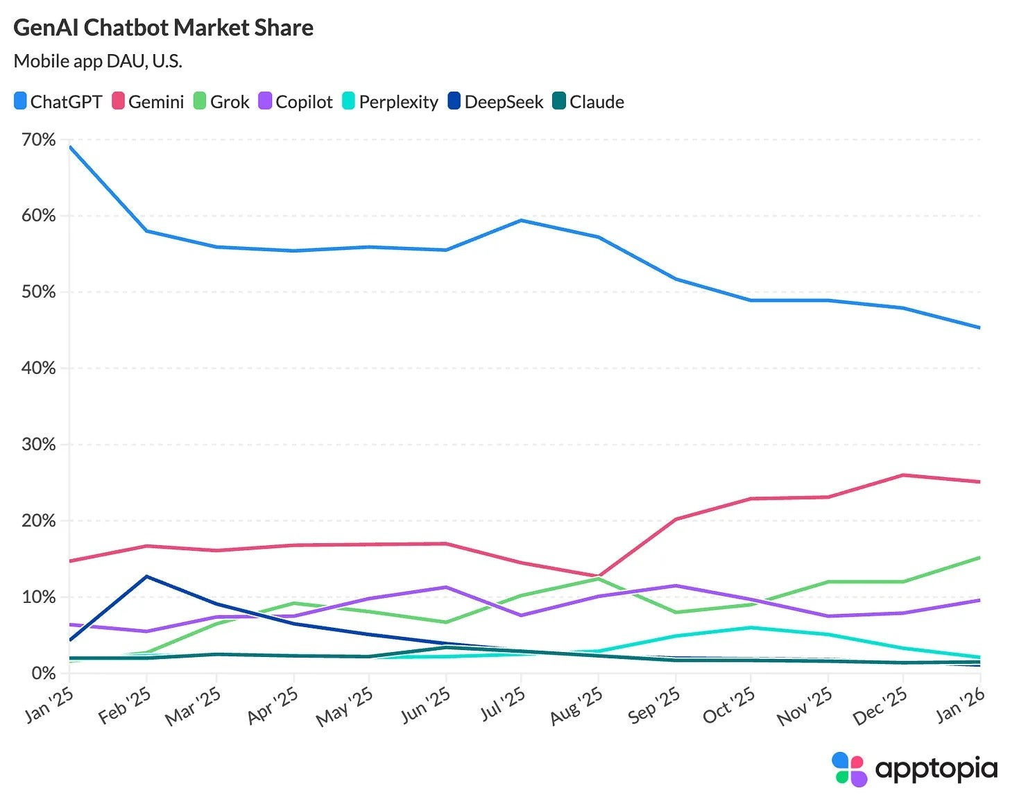 Empiezan a verse las costuras: Microsoft Copilot enfrenta problemas técnicos significativos que generan dudas sobre su IA. Los suscriptores que la tienen como primera opción pasaron de casi el 19% al 11% en los últimos seis meses. En Gemini: de 12,8% a 15%.