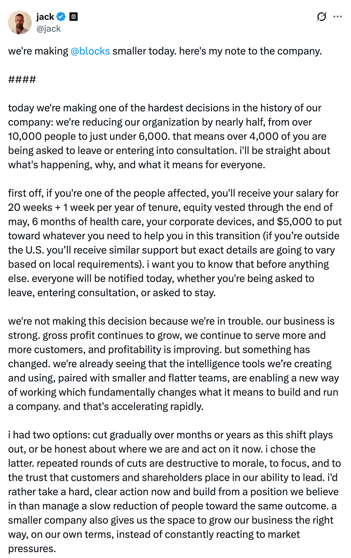 Block (Dorsey) ejecuta despidos para el 40% de la plantilla (4.000 empleados). La clave a la que se agarra: la IA y la automatización de procesos. Profundizaremos en el podcast del próximo lunes.