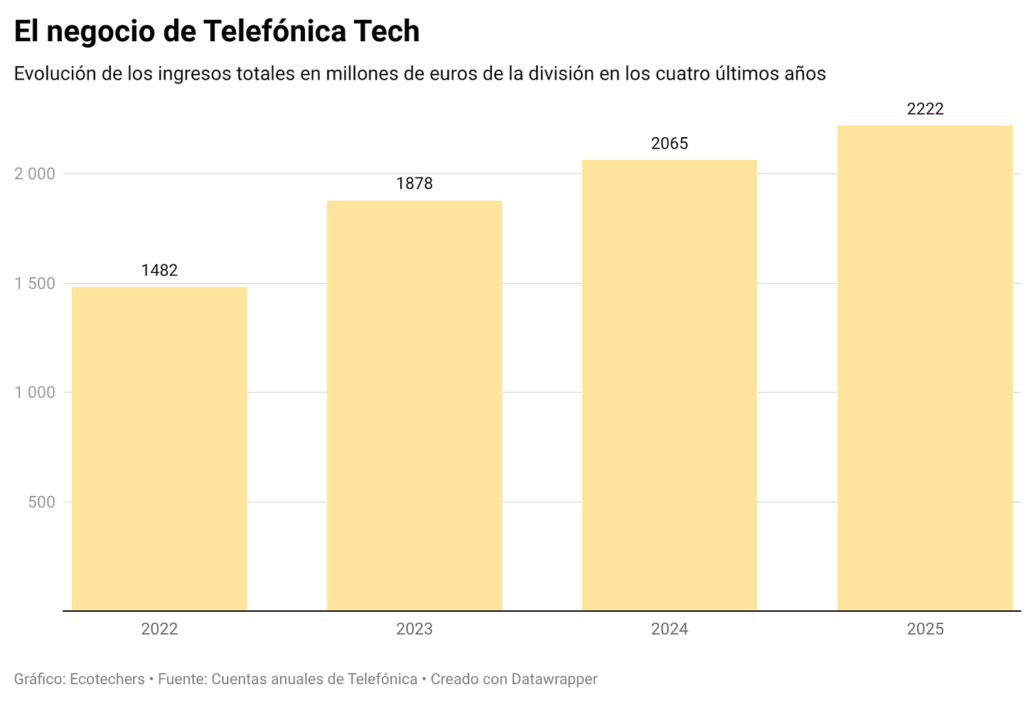 Profundizamos en el brazo tech de Telefónica: sin socio financiero y con la puerta abierta a más compras de startups y tecnológicas. En 2025, €2.200M de ingresos [ver gráfico más abajo]