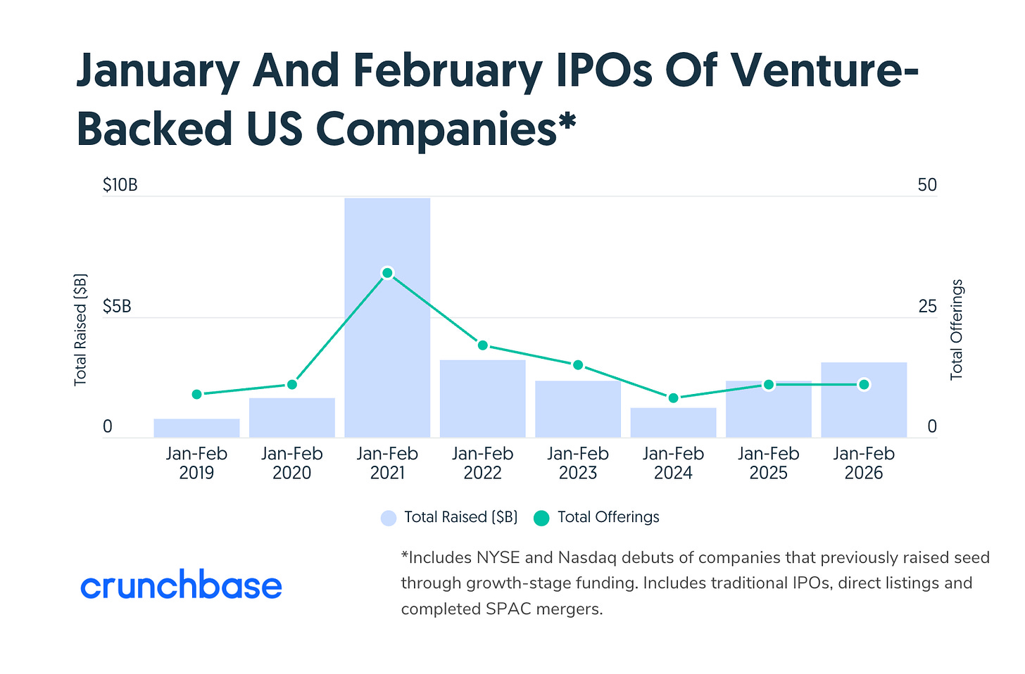 Y sobre el mercado: según Crunchbase (ver gráfico más abajo), en 2026 se han ejecutado 11 salidas a bolsa que recaudan $3.000M pese a la sequía en el sector SaaS.